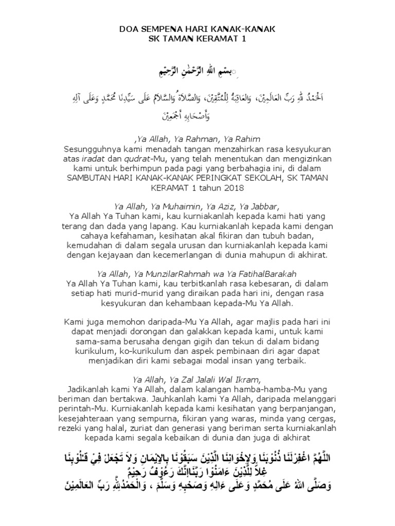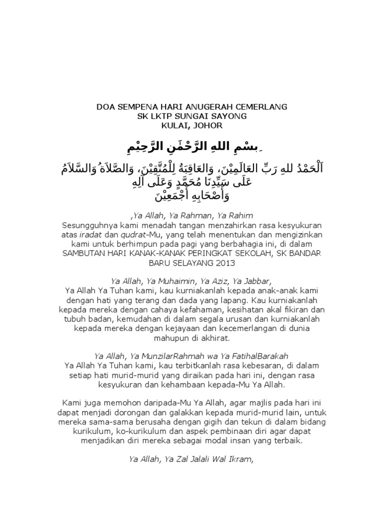 . Umumnya doa sehari-hari ini di ajarkan di. Kanak supaya dapat mengenalpasti sekiranya terdapat unsur-unsur eksploitasi di peringkat awal. Sebagai contohnya bacaan doa bersempena dengan Hari Anugerah Kecemerlangan di sekolah.